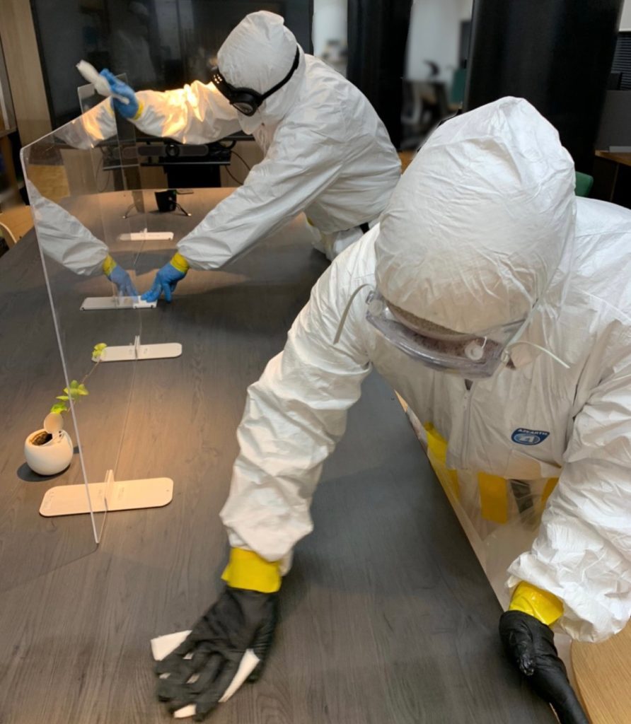 今は必須アイテムとなったアクリル板もしっかりと除菌していきます。