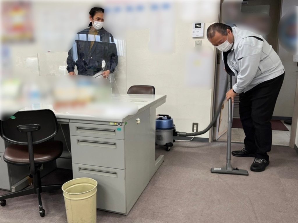 隣に写っている従業員はサボっているわけではなく、掃除機のコードを持ち代表のサポートをしています。笑