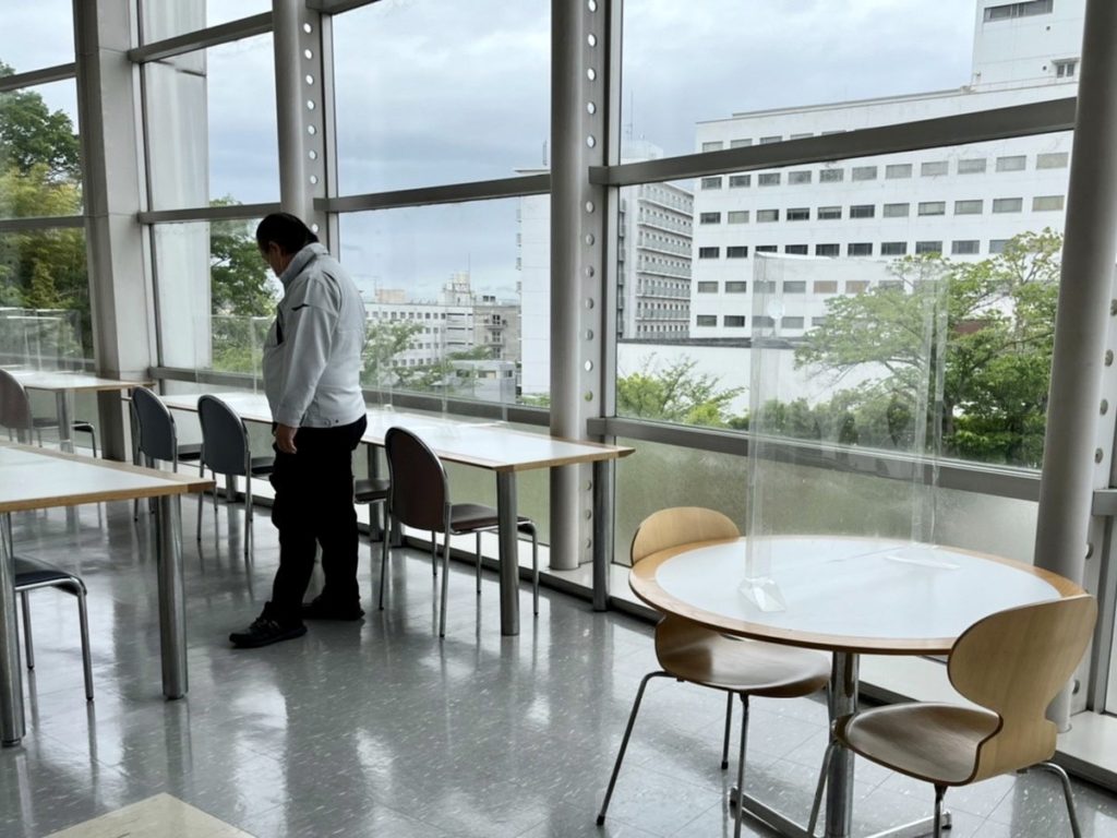 場所が変わりまして大きな社員食堂へ・・・日々の清掃がしっかりとされているか、弊社代表者による厳しい😅視察の様子です。