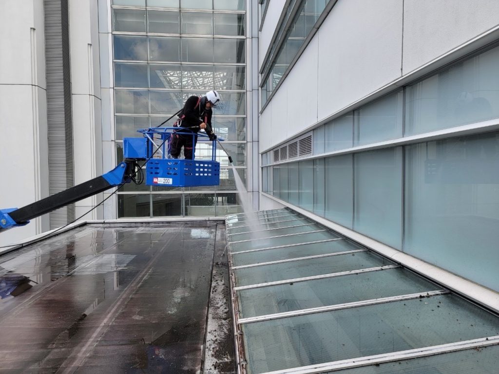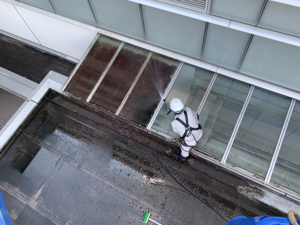 普段、なかなかお掃除しにくい場所も高所作業車を使用して安全に作業をしていきます。