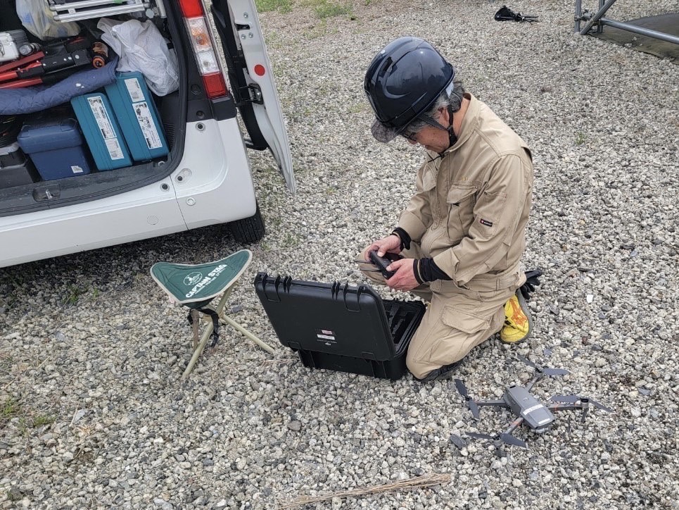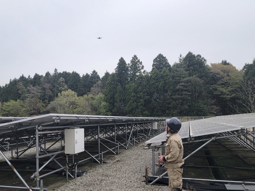 ドローンを使って空からの一気に広範囲の太陽光パネルを点検します( Ꙭ).ᐟ
