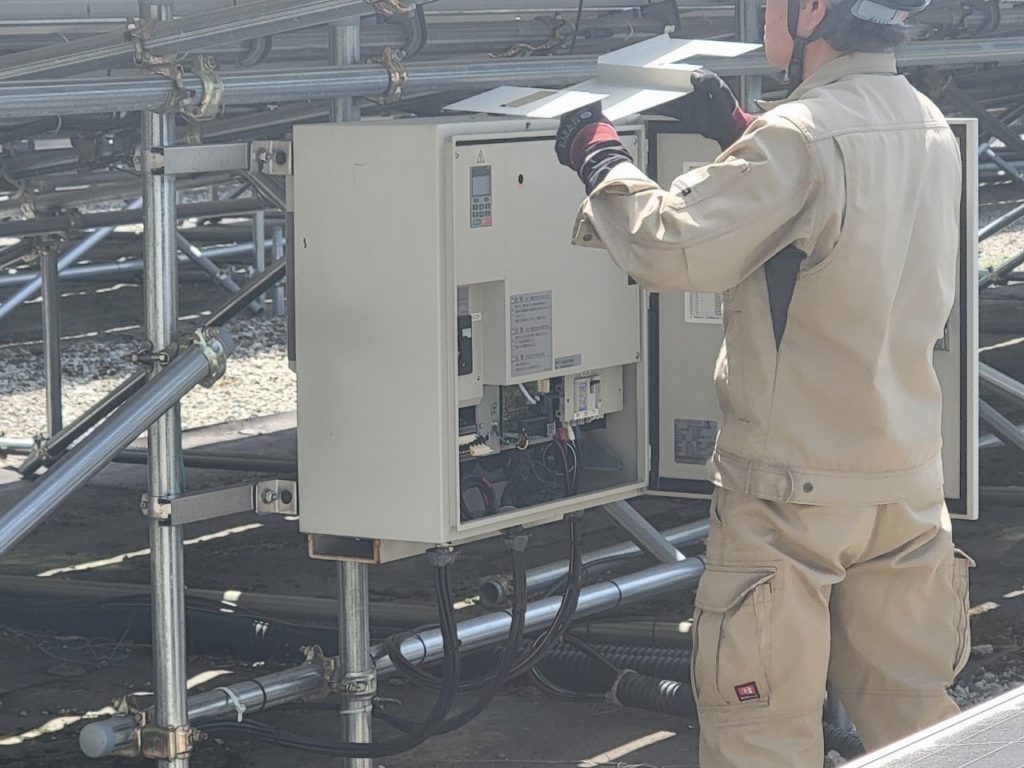 パワコンの出力確認、各配線の抵抗や絶縁状況の検査などの作業をされています( ー̀֊ー́)و