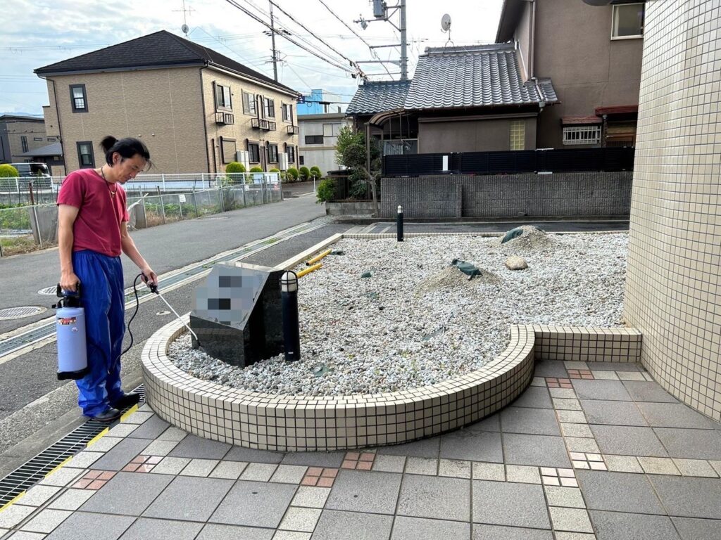 このようにマンションの周辺もしっかり除草剤をまいて夏の雑草対策もしております🌱,,
