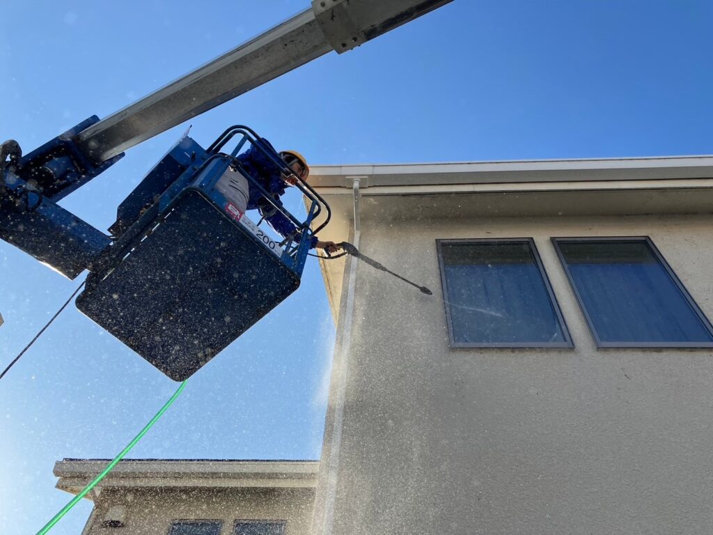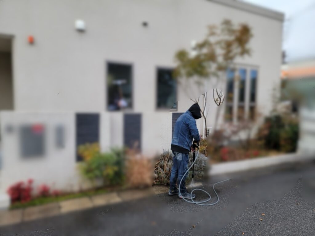 このように白く見えても、高圧洗浄機をかけると面白いくらい白くなりますね。