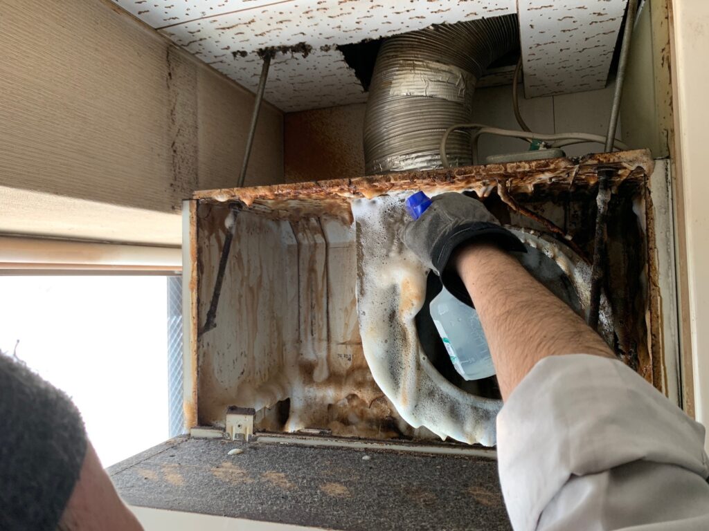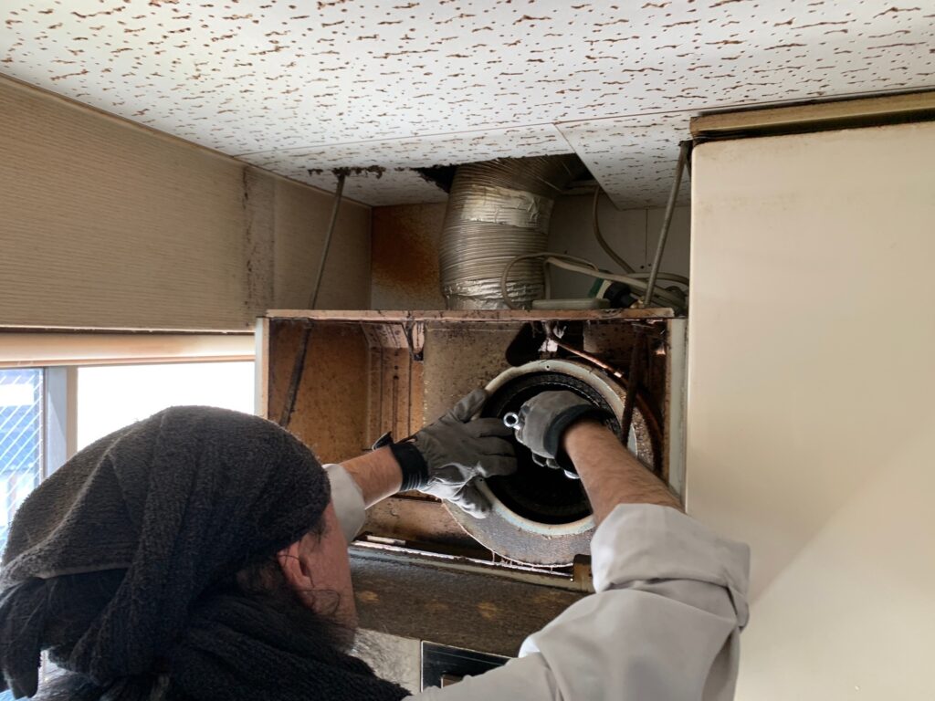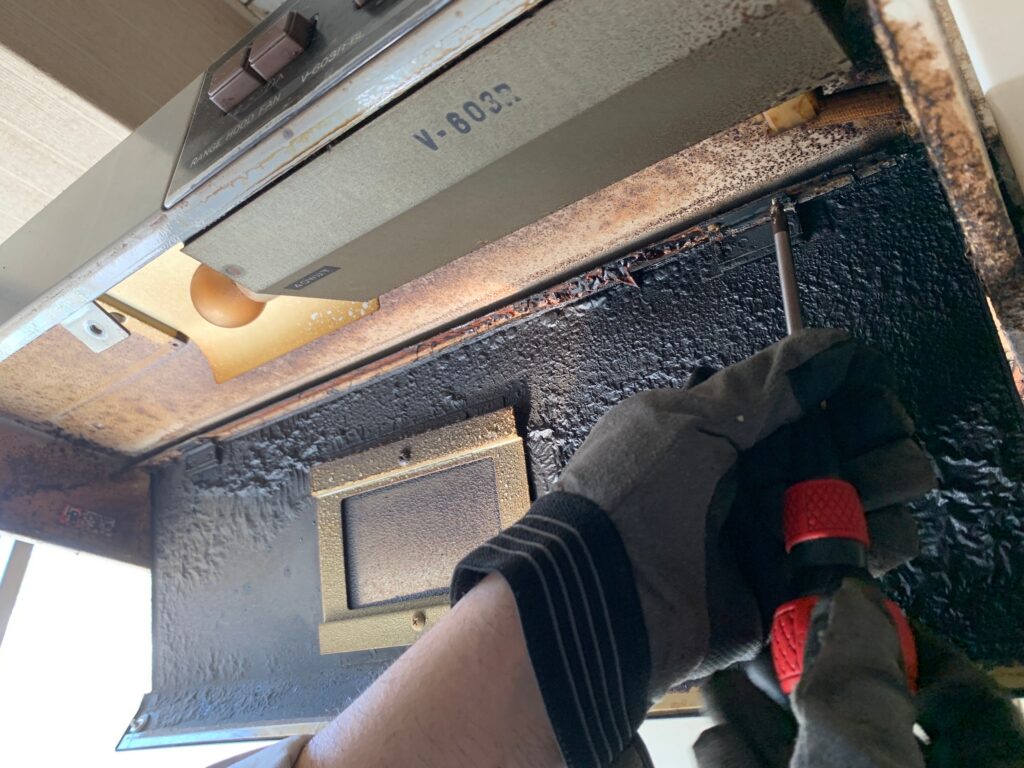 この日は頑固な汚れの換気扇の状況確認と部品を外して浸け置きする工程を先行して実施させて頂きました。