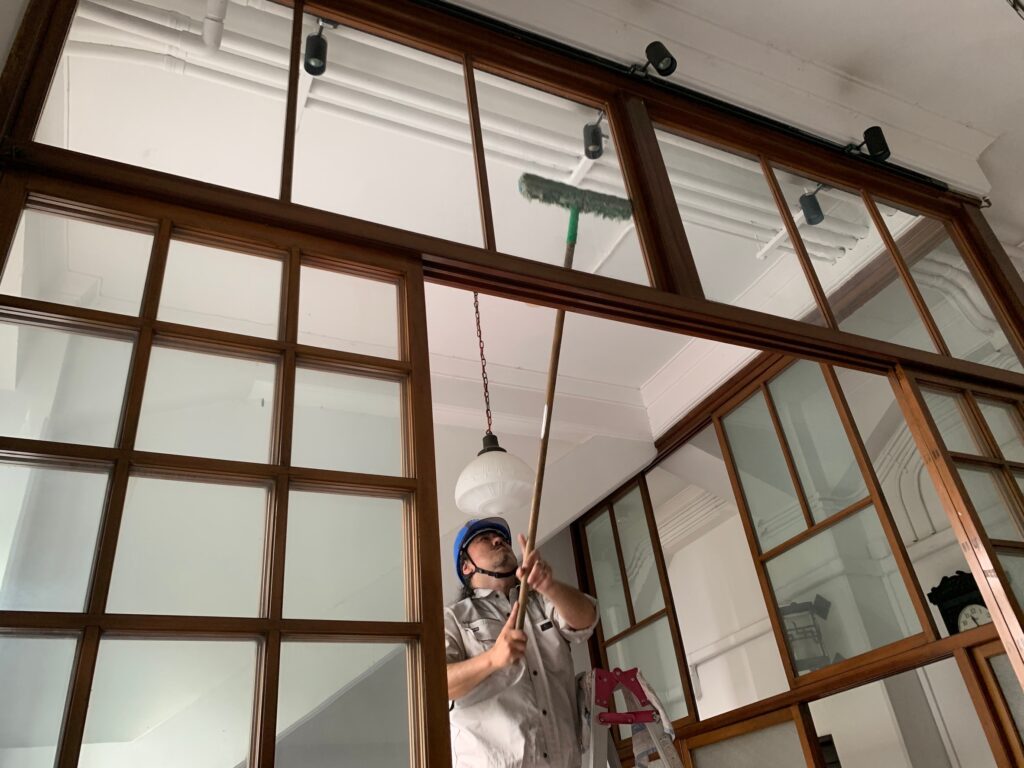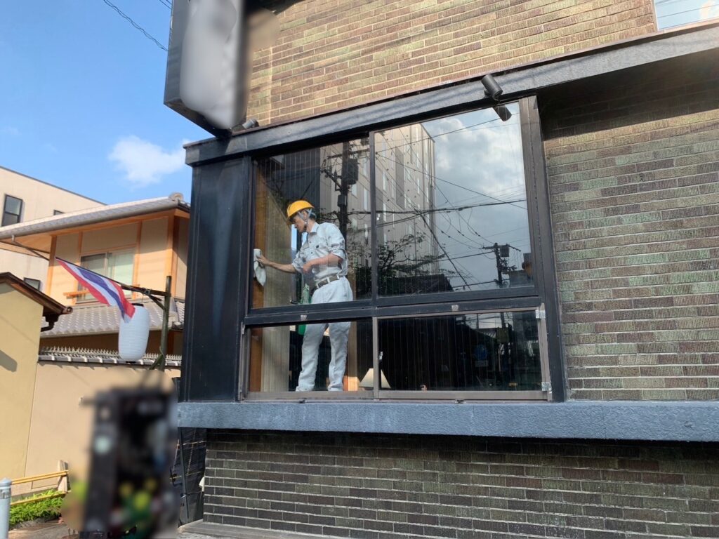 高所作業車や吊りロープなどを使って行う外側の清掃は対応できる業者が限られています。