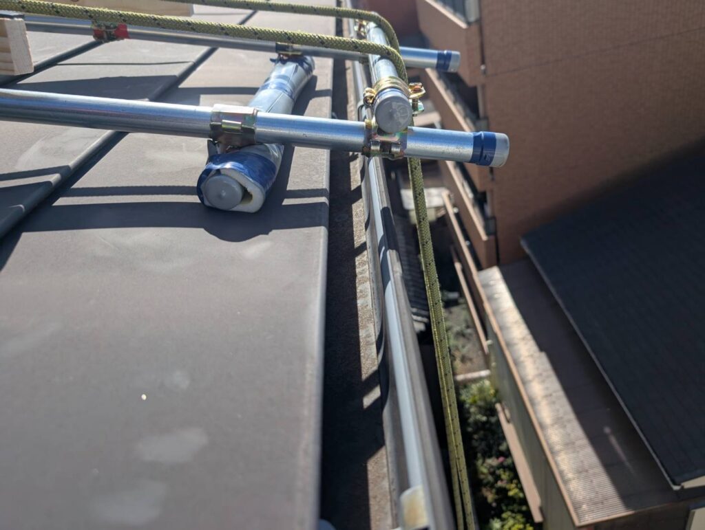 庇・雨樋がある為、普通にワイヤーを降ろしてしまうと負荷がかかり庇・雨樋を傷つけてしまう可能性があるので保護部材製作から始めました。